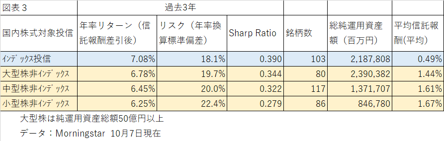 また日経新聞の田村さんから「小型株優位の効果で非インデックスのリターンが上回っているのでは?」と言う趣旨のコメントがあった。私も日本の2000年代以降の長期で見ると、小型株優位のアノマリーが存在しているのは承知していたのでそうかと思ったが、過去3年で計算すると、非インデックス投信のリターンに小型株優位は消えている。(図表3)