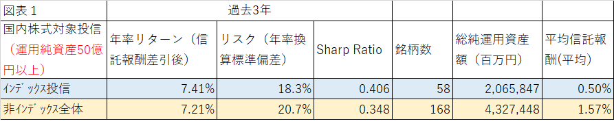 図表1は、Morningstarのサイトからとった国内株式対象の投資信託のインデックスファンドと非インデックスファンドの過去3年間のリターン、リスク、シャープレシオだ。リターンでもシャープレシオでもインデックスが上回っているのがわかる。